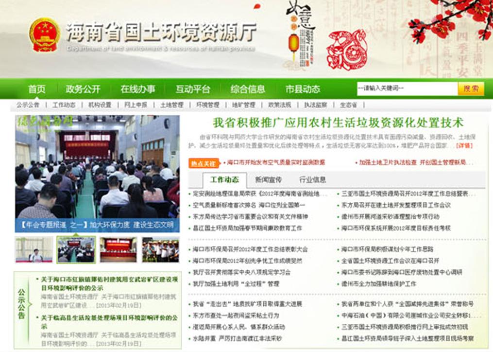 近日,海南省国土资源厅和省生态环境保护厅主站顺利上线运行,这也是继原海南省国土资源环境厅分化为海南省国土资源厅和海南省生态环境保护厅后在网站运营方面的配合动作。海南省国土资源厅主管全省土地资源、矿产资源等自然资源的规划、管理、保护和合理利用工作;海南省生态环境保护厅,主管全省生态环境保护工作。